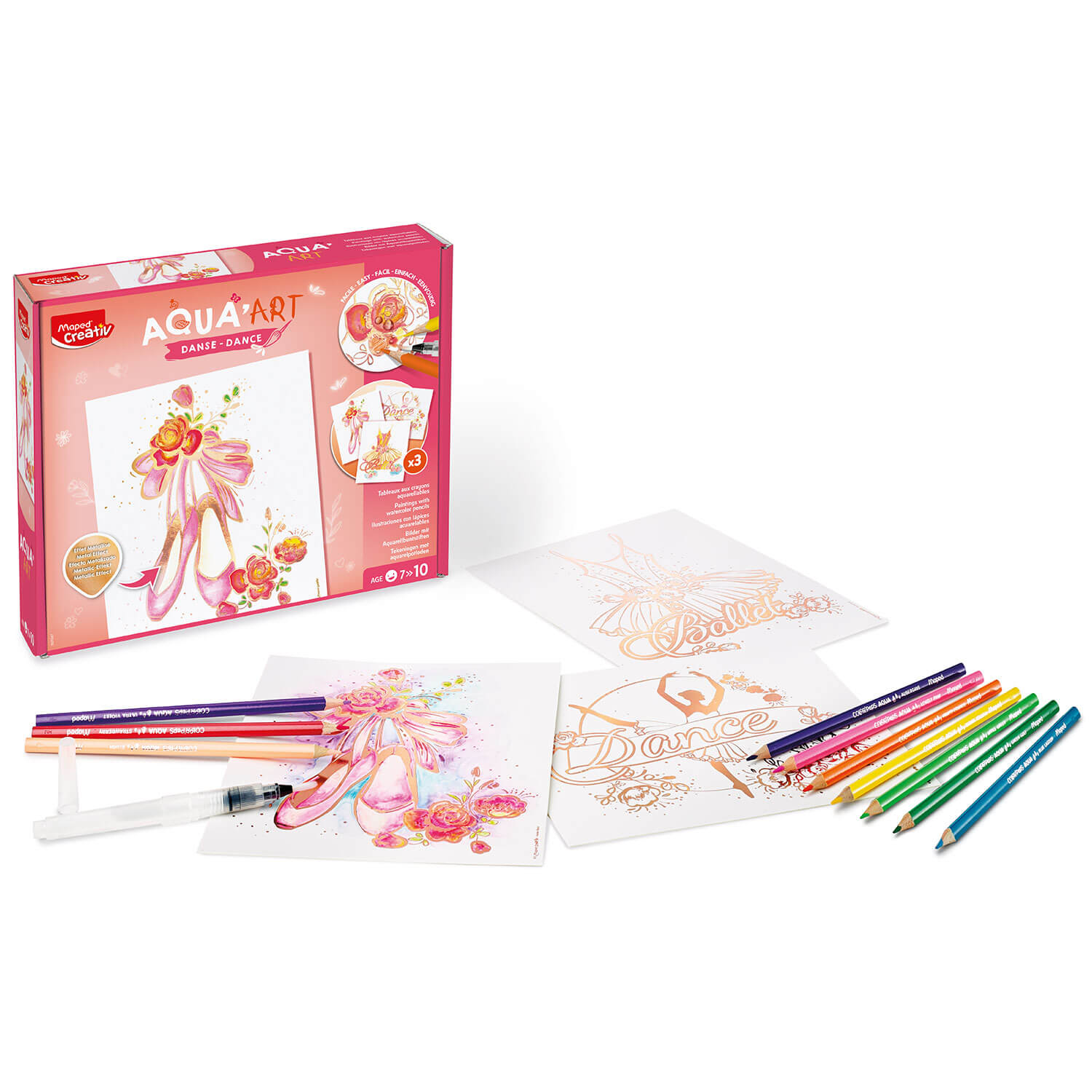 Uwielbiasz taniec? Chcesz ozdobić ściany błyszczącymi i połyskującymi w dzień i w nocy obrazkami z tanecznym wątkiem? W zestawie od Maped Creativ znajdziesz 3 szablony ozdobione błyszczącymi elementami do pokolorowania kredkami akwarelowymi. Nie wyjeżdżaj za linię, nie koloruj połyskujących elementów. Kiedy obrazek jest gotowy, sięgnij po wodny pędzelek i pomaluj wszystkie albo tylko wybrane elementy jeszcze raz: pod wpływem wody kolory przepięknie się rozmywają, dając efekt WOW. Przy tej pracy nie ubrudzisz rąk, a wodny pędzelek możesz uzupełniać wodą z kranu. Niesamowite efekty wizualne gwarantowane! Dla dzieci od 7 roku życia. Zestaw zawiera: 3 karty z papieru ziarnistego do pokolorowania, pędzelek wodny, 10 kredek akwarelowych, instrukcję.