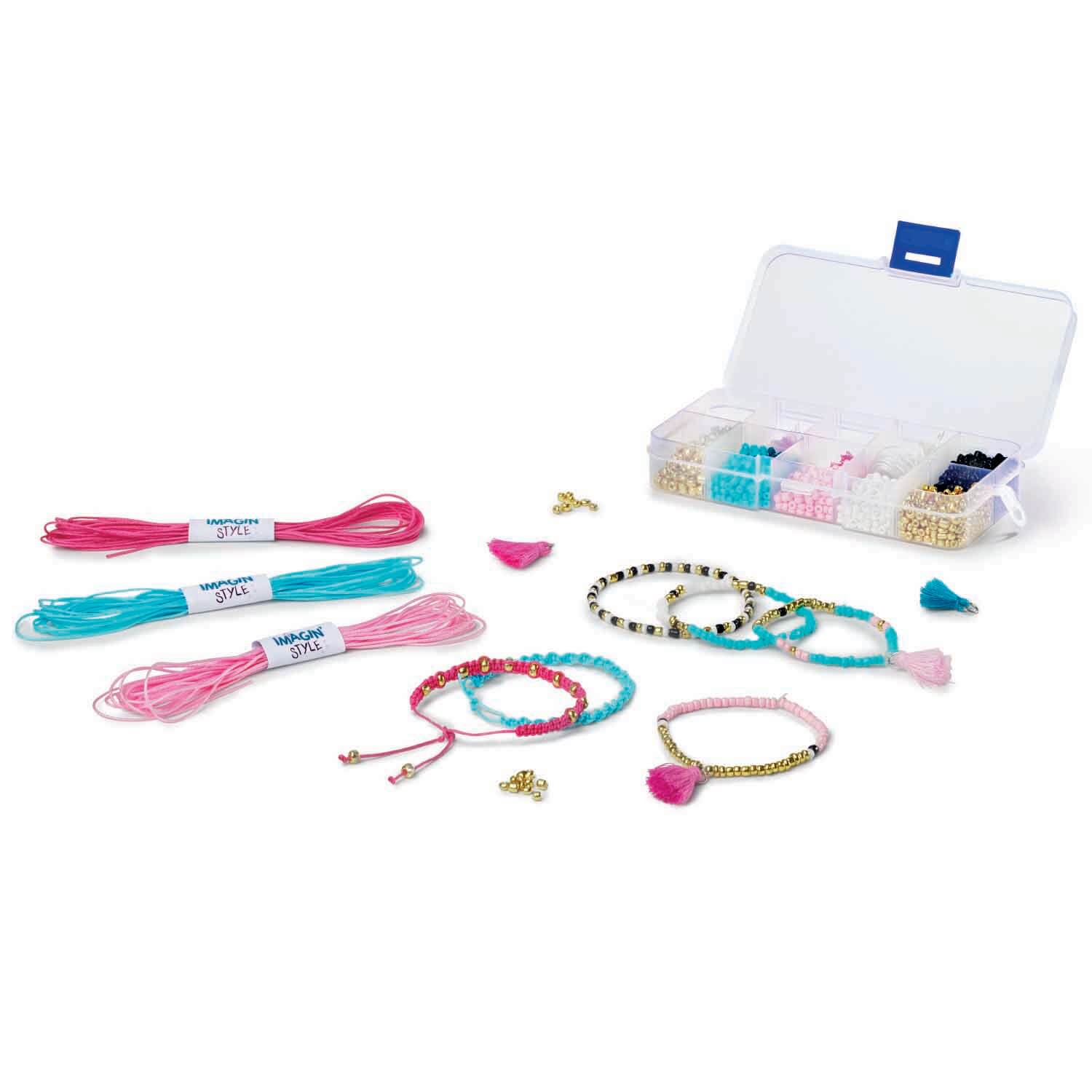 Zestaw do tworzenia różnokolorowych bransoletek dwoma technikami. Zawiera wszystkie potrzebne elementy – ogranicza nas tylko wyobraźnia! Tekturowe pudełko, w którym znajduje się cały zestaw, jest jednocześnie organizerem i warsztatem pracy małego artysty. Pudełko zawiera przegródki, miarkę, wcięcia na mocowanie sznureczka itp. W zestawie znajduje się również pojemnik do przechowywania i segregowania koralików. Samodzielne tworzenie i komponowanie nowych wzorów bransoletek staje się dziecinnie proste. Zabawa daje dumę i satysfakcję z samodzielnie wykonanej pracy, a niepowtarzalne bransoletki na ręce pozwalają poczuć się naprawdę wyjątkowo. Zawiera: tekturowe pudełko z narysowaną miarką, nacięciami (które ułatwiają wykonanie bransoletek) oraz przegródkami, plastikowe pudełko, w którym posegregowane zostały: koraliki mniejsze – 5 kolorów po 10 g (złote, srebrne, niebieskie, czarne i różowe), koraliki większe – 2 kolory po 2 sztuk (złote i srebrne), 4 ozdobne, kolorowe frędzle, gumkę o długości 300 cm (która umożliwia wykonanie 10 bransoletek), 3 sztuki kolorowych sznureczków każdy o długości 450 cm (które umożliwiają wykonanie 6 bransoletek), prostą instrukcję wykonania bransoletek w dwóch technikach.