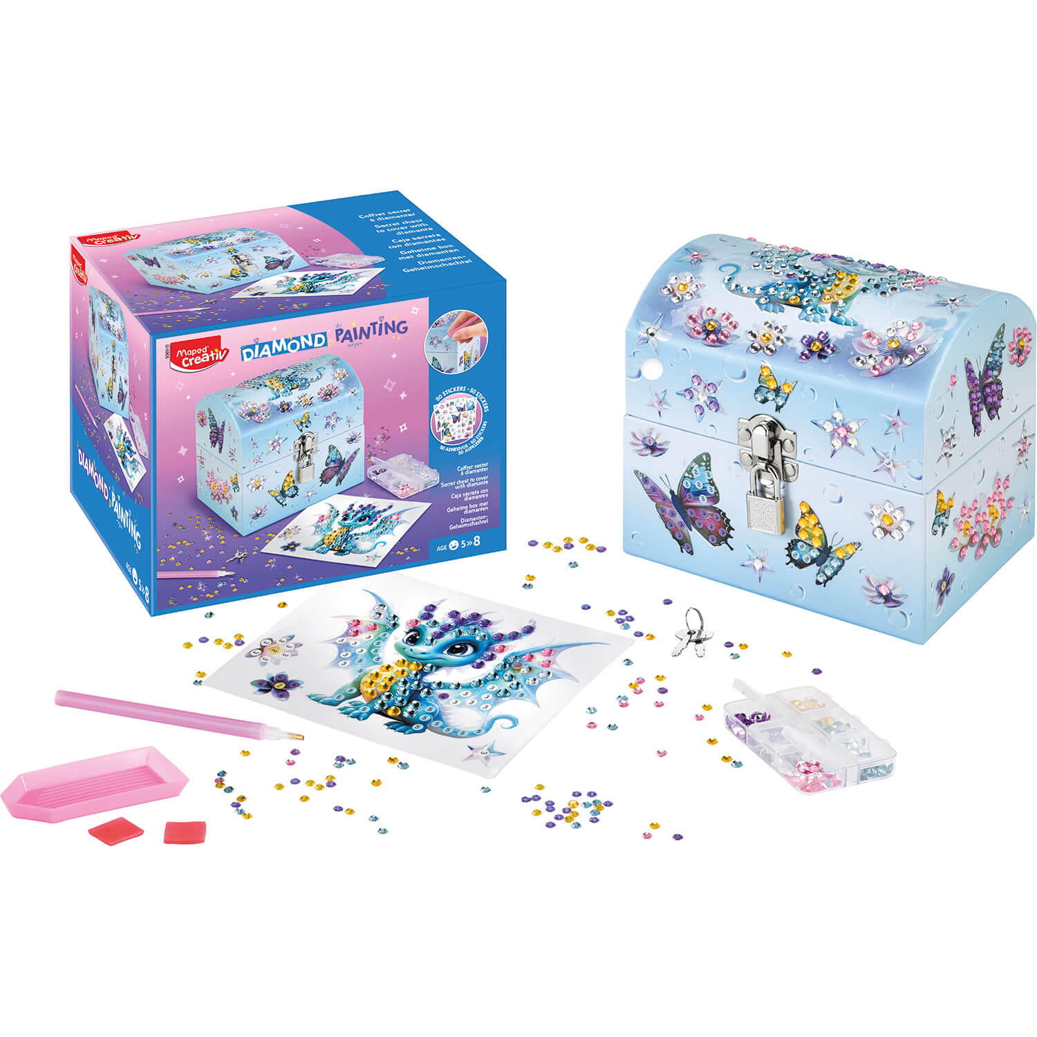 Zestaw kreatywny dla dzieci Diamentowe Mozaiki – sekretny kuferek to kreatywny zestaw dla dzieci od 5 roku życia, które rozwijają kreatywność i precyzję.