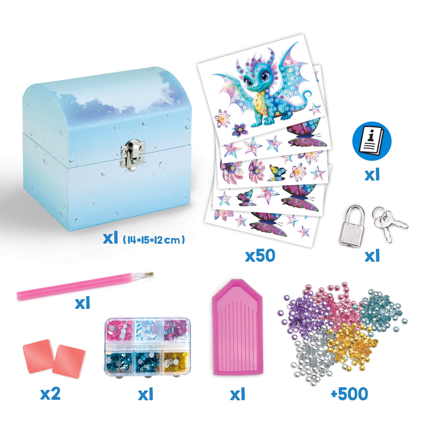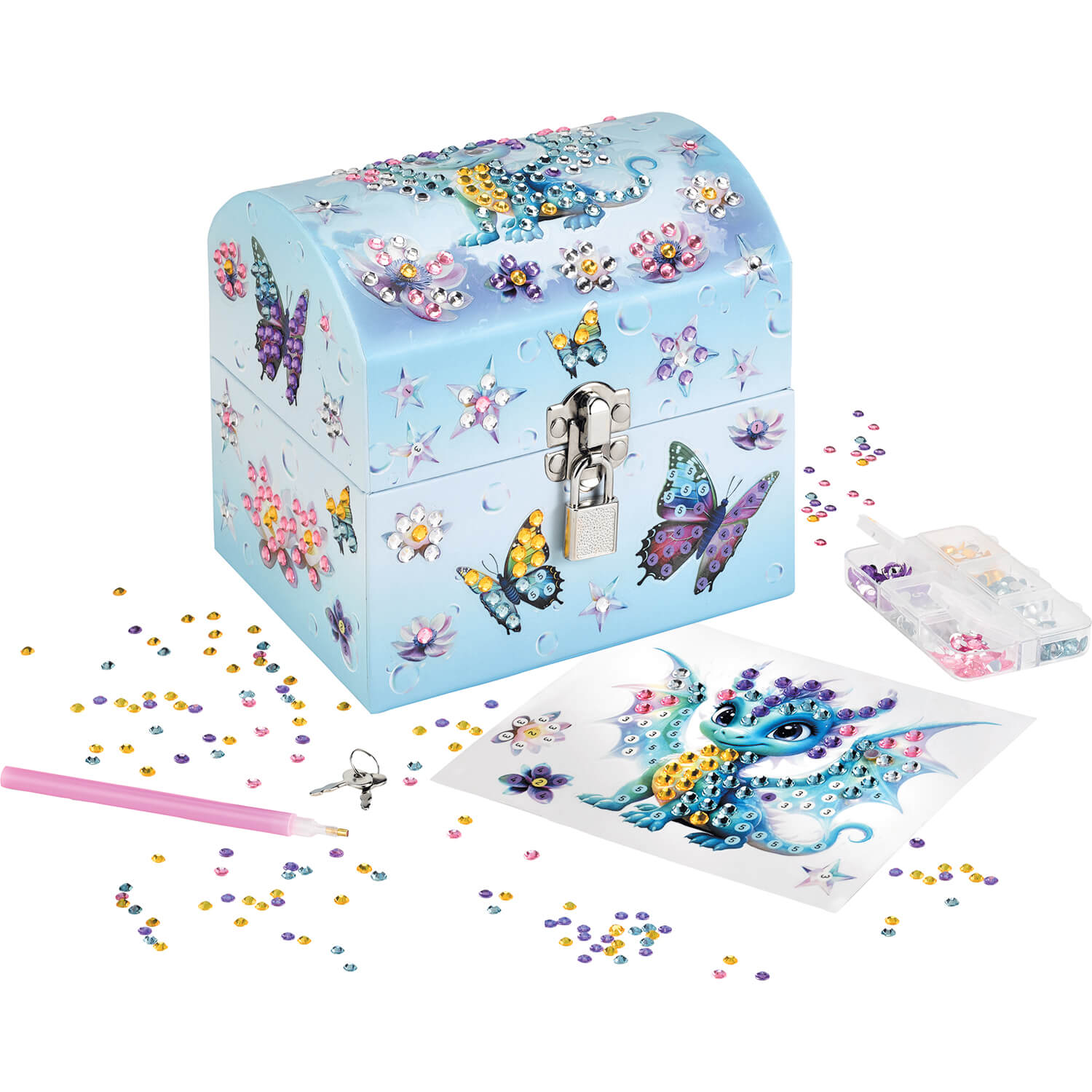 Dziecko ozdabia kuferek naklejkami i kolorowymi diamencikami, tworząc efektowny, błyszczący wzór 3D. Układanie elementów wspiera koncentrację, cierpliwość i wyciszenie, a także rozwija zdolności manualne. Dołączone akcesoria ułatwiają pracę i organizację.