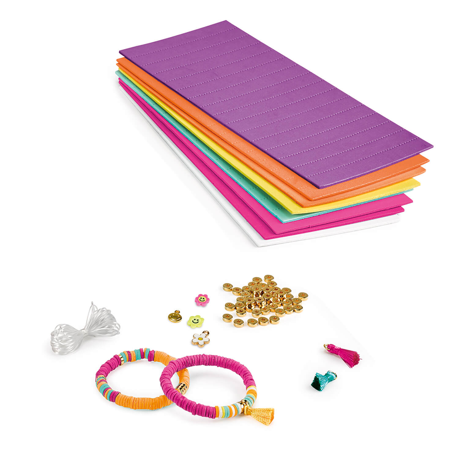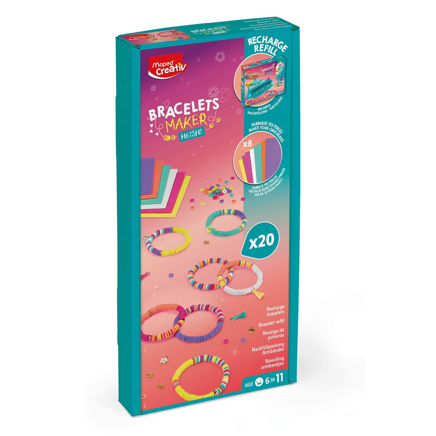 Fabryka bransoletek zestaw uzupełniający. Zestaw zawiera: 3 frędzle, 10 okrągłych złotych koralików, 4 charmsy, 500 cm elastycznej nici, 8 arkuszy z tworzywa EVA w 6 kolorach (tworzywo bezpieczne, lekkie doskonale poddające się cięciu, a jednocześnie przyjemne w dotyku). Możliwość stworzenia 20 nowych bransoletek.