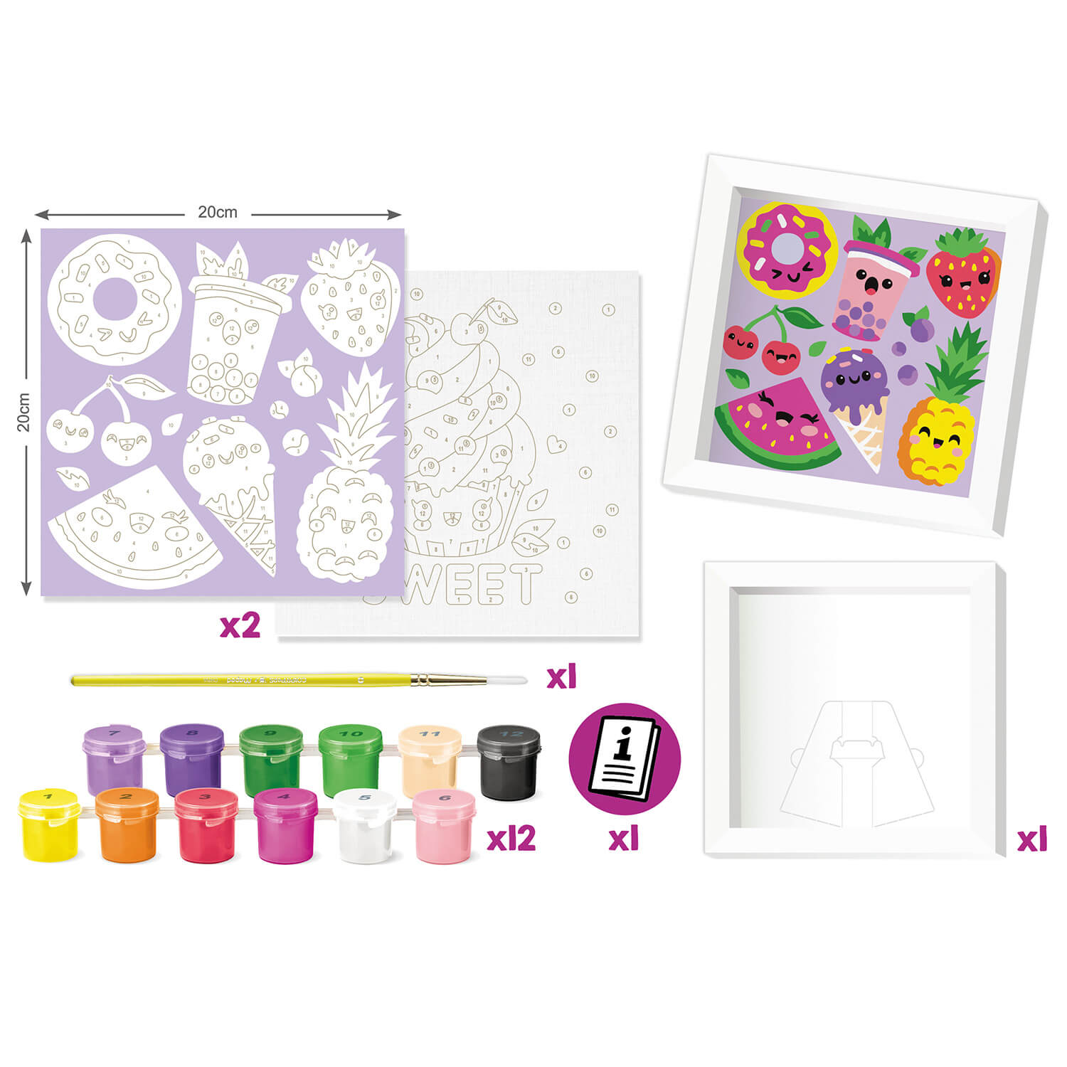 Zaproś dziecko do świata kolorów i kreatywnej zabawy z zestawem Malowanie po numerkach – Sweet: smakołyki! Ten uroczy zestaw, idealny dla dzieci od 7 roku życia, pozwala w prosty i przyjemny sposób rozwijać pierwsze artystyczne umiejętności. Zadaniem młodych twórców jest wypełnienie oznaczonych pól odpowiednimi kolorami zgodnie z przypisaną numeracją. Wyraźne linie i cyfry pomagają w precyzyjnym malowaniu, a po zakończeniu pracy znikają pod warstwą barw, odsłaniając słodkie ilustracje smakowitych deserów i innych smakołyków.Malowanie po numerach stymuluje kreatywność, ćwiczy sprawność manualną, poprawia koncentrację i przynosi ogromną satysfakcję z ukończonego dzieła. Gotowe obrazki można oprawić w dołączoną ramkę i pięknie wyeksponować lub podarować bliskim jako oryginalny prezent. W zestawie znajdziesz: dwa obrazki o wymiarach 20 × 20 cm, kartonową ramkę, 12 pojemniczków z farbami akrylowymi (5,4 ml każda), pędzelek oraz dwa szablony z numeracją. Stwórz własne, kolorowe królestwo słodkości – zabawa z zestawem Sweet gwarantuje mnóstwo radości i satysfakcji!