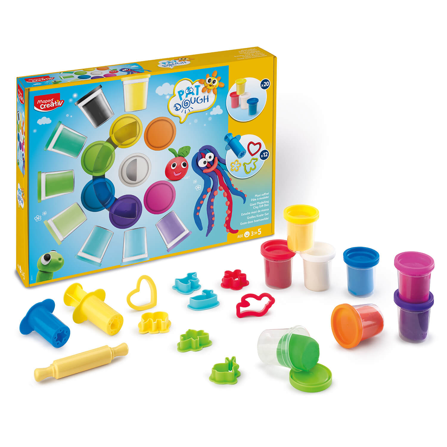 Duży zestaw z masą plastyczną w 20 intensywnych barwach z dodatkowymi akcesoriami do zabawy. Idealny dla miłośników kolorowej zabawy! Miękka, nieklejąca się masa plastyczna. Nietoksyczna i bezpieczna. Transparentne pojemniki zawierają 56 g masy, umożliwiają podgląd zawartości bez otwierania. Zawartość: 20 pojemników z masą 56 g, 12 różnorodnych akcesoriów do cięcia i modelowania (wałek, foremki, plastikowy nożyk, wyciskarki). Zestaw przeznaczony dla dzieci od 3 roku życia.