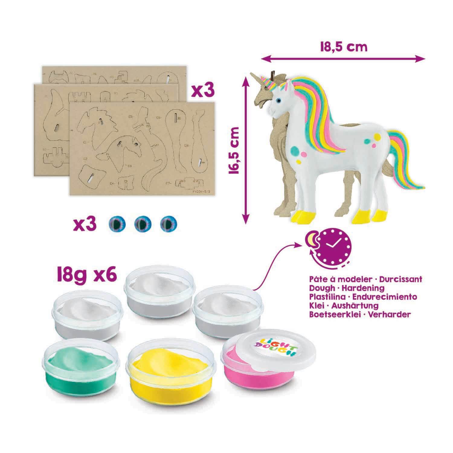 Wyjątkowa forma numerowanych puzzli pozwala złożyć drewniany szkielet jednorożca w wymiarze 3D, aby następnie wymodelować jego sylwetkę przy użyciu masy plastycznej. Piękne, pastelowe kolory modeliny czynią jednorożca bajecznie pięknym. Figurka może być zarówno zabawką, jak i dekoracją dziecięcego pokoju. Do złożenia figurki nie jest potrzebny klej. Modelina twardnieje po 4 godzinach. Wymiary figurki po złożeniu: wysokość 16,5 cm, szerokość 18,5 cm. Puzzle są zapakowane w piękne, kolorowe pudełko z tektury. Zestaw zawiera: 3-częściowy zestaw drewnianych puzzli 3D, naklejki w kształcie oczu, 6 pojemników masy plastycznej 18 g w kolorach: 3 x biały, zielony, różowy, żółty, instrukcję.