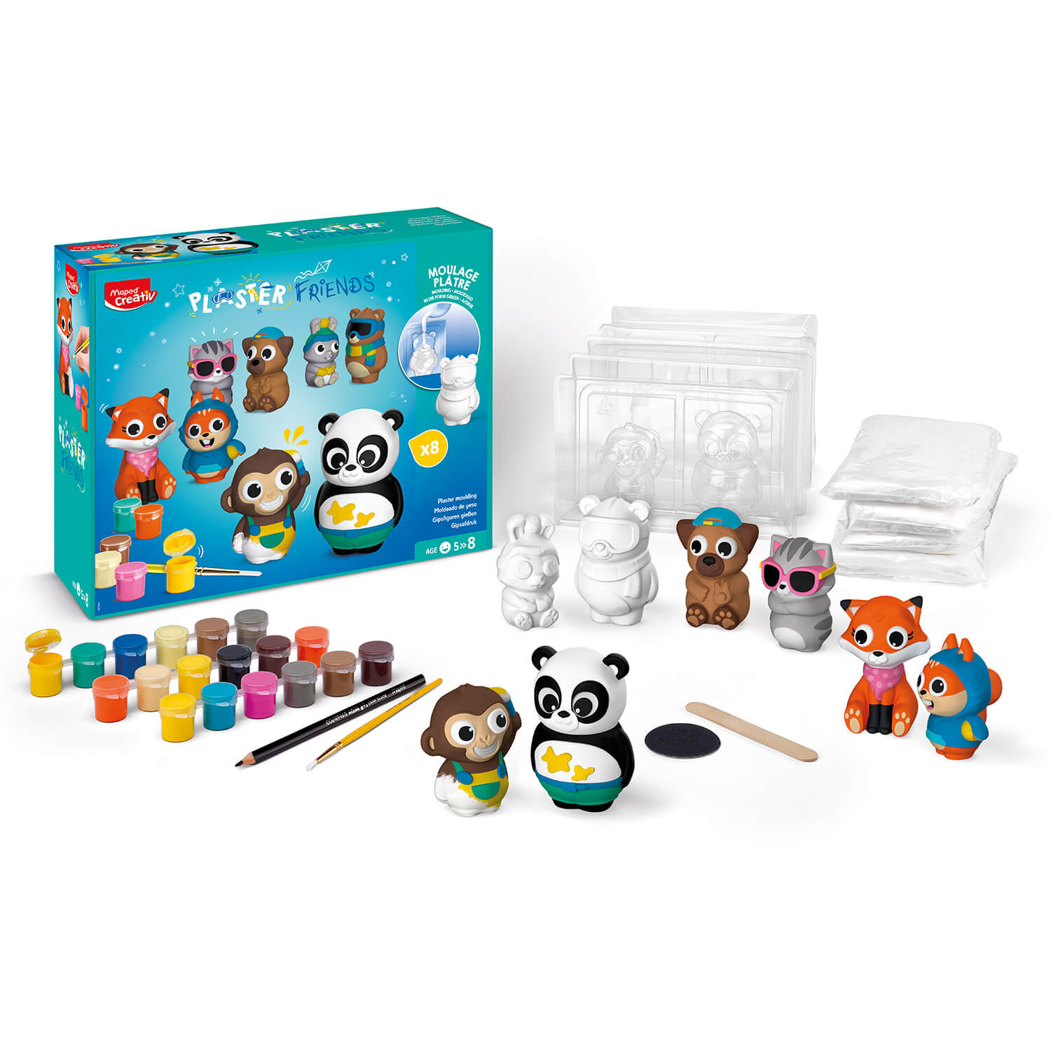 Zestaw do przygotowania kolorowych odlewów gipsowych grupy ośmiu zwierzaków o wysokości 8,5 cm. Proste wykonanie: szybko schnący gips i wyznaczone obszary do pomalowania. Gwarantowany rezultat dzięki farbom i kredce do kolorowania w zestawie, którymi ozdobisz gotowe figurki zwierzątek. Właściwości edukacyjne zestawu: 2 w 1 – odlewanie i malowanie, uczy zręczności i precyzji, ćwiczy cierpliwość i koncentrację. Zestaw przeznaczony dla dzieci od 5 roku życia. Zestaw zawiera: formy do odlewów, 4 torebki gipsu po 300 g, drewniana szpatułka, papier ścierny, farby w 18 intensywnych kolorach, pędzelek, czarna kredka Aqua do wykończenia szczegółów.