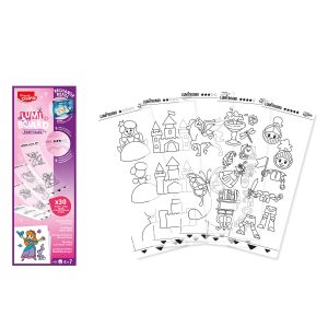 W zestawie znajdziesz szablony przedstawiające księżniczki, elfy, czarodziejów, skrzydlate konie, smoki i królewiczów, a także bajkowe akcesoria, karety i magiczne symbole. Każdy arkusz ma oznaczony poziom trudności od 1 do 5 gwiazdek, dzięki czemu mała artystka może rozwijać swoje umiejętności krok po kroku – od prostych szkiców po mistrzowskie ilustracje!