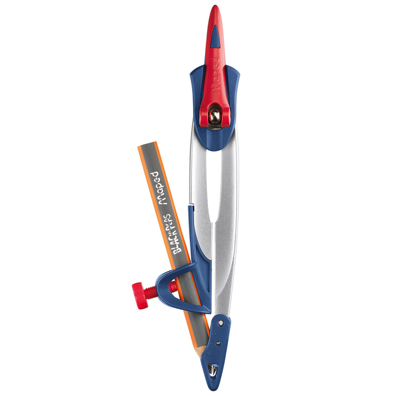 Metalowy cyrkiel w plastikowym etui w zestawie z ołówkiem. Opatentowany system blokady ramion w określonej pozycji. Specjalna nakładka na igłę zabezpiecza przed skaleczeniem.
