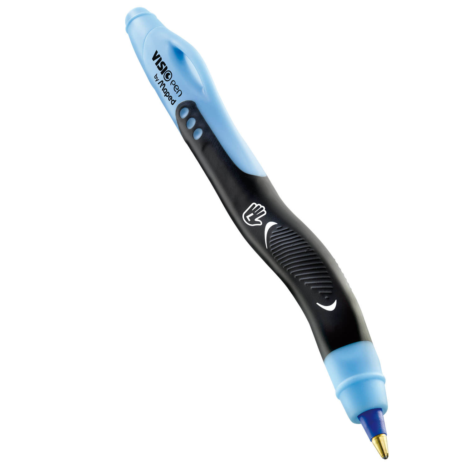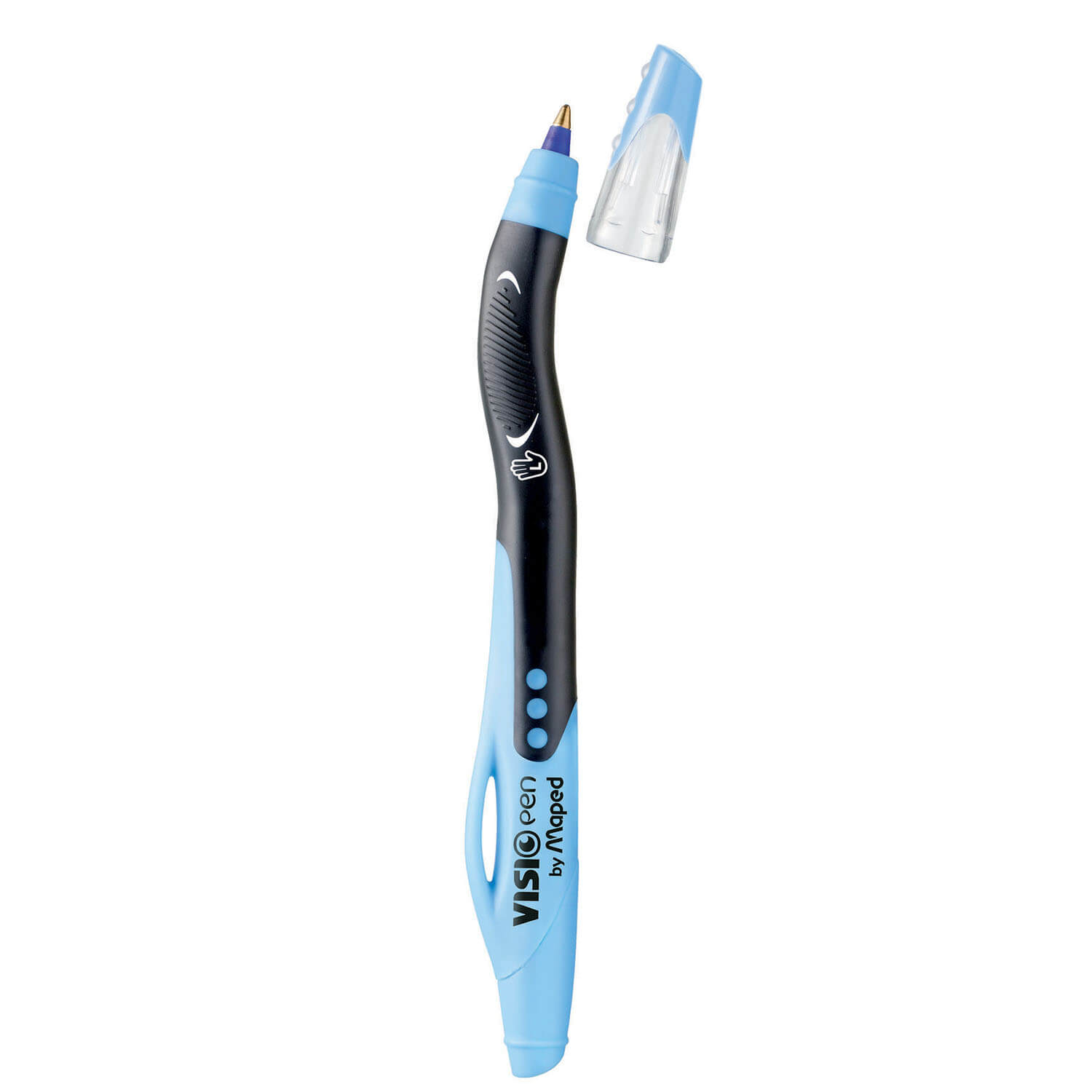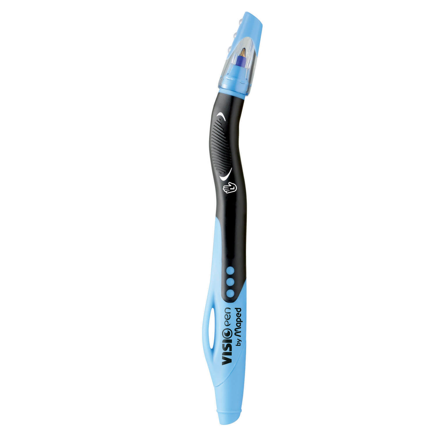Długopis dla leworęcznych VISIO PEN ma ergonomiczny kształt i przekrzywioną końcówkę ułatwiającą właściwy uchwyt. Większa część długopisu jest pokryta miękkim materiałem antypoślizgowym. Grubość linii M, kolor niebieski.