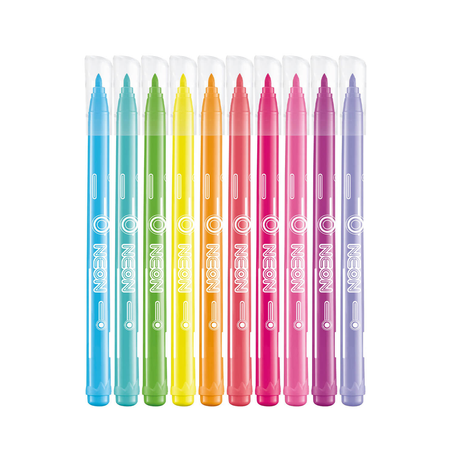 Flamastry Neon 10 kolorówNeonowy trend niezmiennie urzeka. Nowa kolekcja Maped Neon podąża w tym kierunku. Żywa i przyciągająca wzrok paleta kolorów jest idealnym wyborem dla wszystkich tych, którzy są gotowi odważnie wyrazić siebie. Nasycone i soczyste kolory dodają świeżości i energii rysunkom, notatkom i wnętrzu piórnika. Flamastry z kolekcji Neon w 10 intensywnych kolorach. Idealne do pisania i kolorowania. Trwały tusz, nie rozmazuje się. Pozostawione bez skuwki nie zasychają przez 7 dni. Zmywalne ze skóry rąk i większości tkanin. Bezpieczna, zablokowana przed usunięciem, wytrzymała końcówka o grubości 2,8 mm. Transparentna, wentylowana skuwka. Flamastry w 10 kolorach pakowane w kartonowe etui.