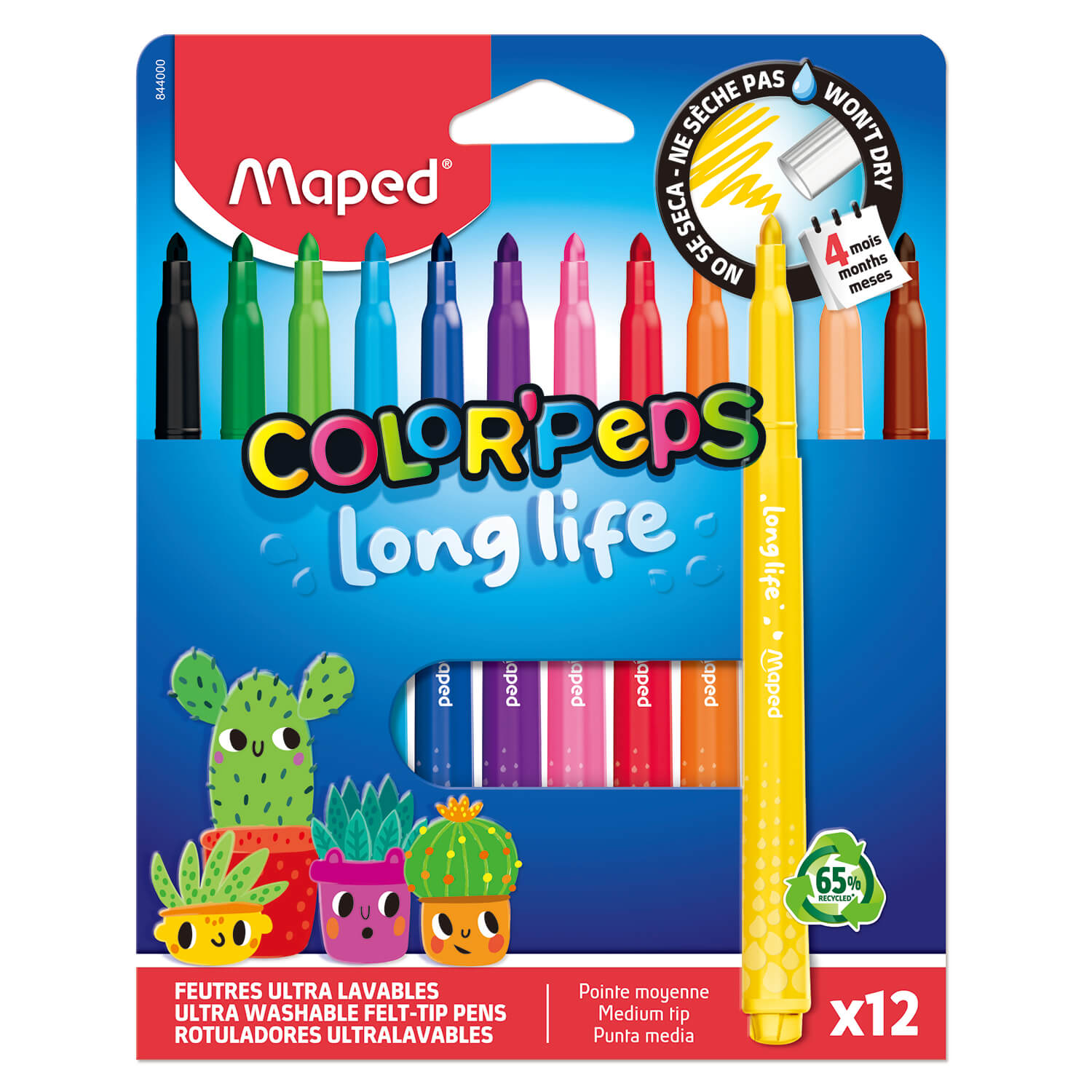 Flamastry Maped Long Life 12 kolorów to praktyczne flamastry szkolne, które doskonale sprawdzą się w codziennych zadaniach plastycznych i podczas kolorowania w domu. Zestaw podstawowych barw zapewnia wszystko, czego potrzebuje uczeń na lekcjach. Technologia Long Life sprawia, że flamastry dla dzieci nie wysychają bez skuwki nawet przez 4 miesiące. Wytrzymała, zablokowana końcówka 3,7 mm jest odporna na nacisk i umożliwia rysowanie cienkich oraz grubszych linii. Ergonomiczny, trójkątny uchwyt wspiera wygodny chwyt i prawidłowe ułożenie dłoni. Intensywne kolory gwarantują wyraziste prace, a tusz łatwo zmywa się ze skóry i większości tkanin wodą z mydłem. Dodatkowo flamastry Maped wykonano w 65% z surowców wtórnych – to trwałość i odpowiedzialny wybór w jednym.
