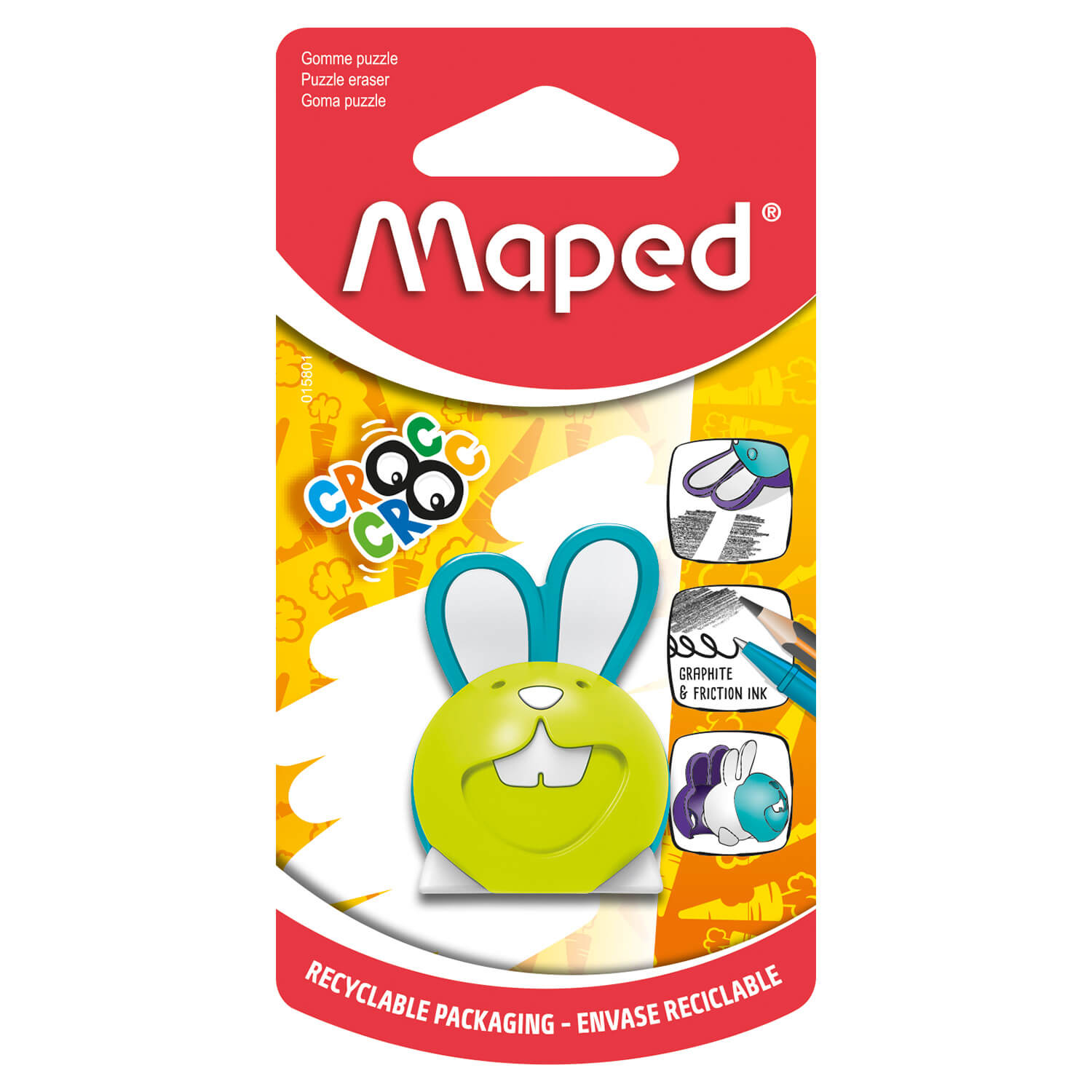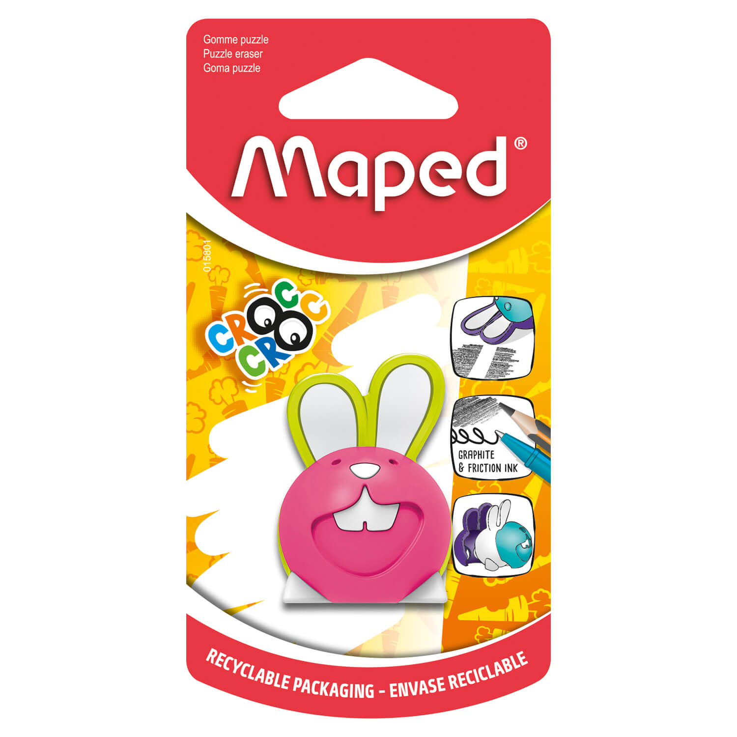 Złożona z trzech elementów, które doskonale do siebie przylegają tak, jak puzzle. Można ją składać i rozkładać nieskończoną ilość razy, rozładowując emocje, bawiąc się i relaksując jednocześnie. Gumka ma podwójne zastosowanie – do ołówków i do długopisów wymazywalnych. Kształt gumki zapobiega jej wyślizgiwaniu się z ręki podczas ścierania. Gumka Croc Croc Puzzle stanowi uzupełnienie kolekcji temperówek z rodziny Croc Croc. Nie zawiera PVC i ftalanów. Miks kolorów: różowy, zielony, niebieski.