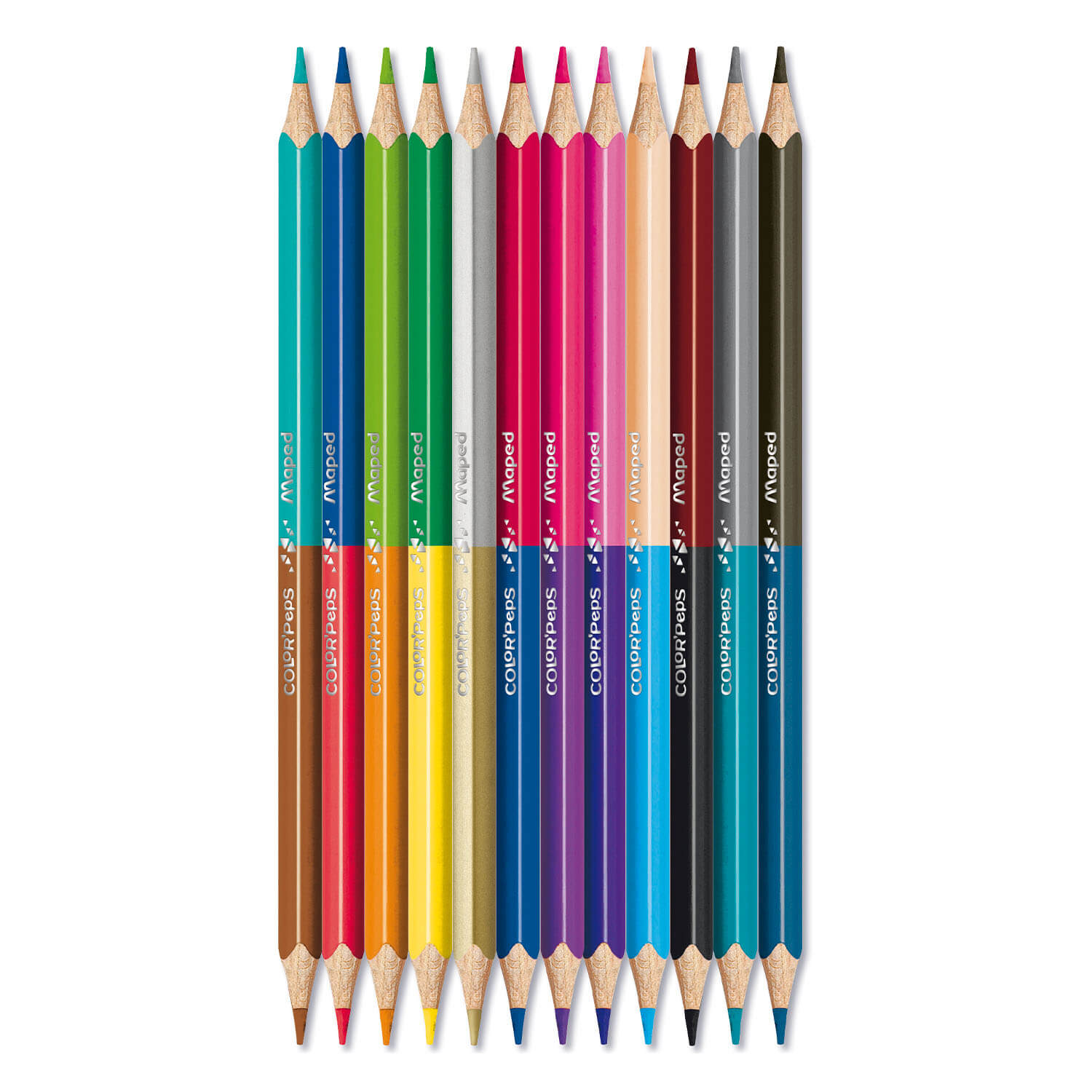 Kredki dwustronne Color’Peps Duo Colors to dwukrotnie większa ilość kolorów w każdym etui: 12 szt = 24 kolory. Wykonane w 100% z drewna pozyskanego bez naruszenia bogactw biologicznych i struktury lasu – posiadają certyfikat FSC. Trójkątny, ergonomiczny przekrój. Intensywne kolory. Łatwe do temperowania. Grafit o przekroju 2,9 mm, odporny na kruszenie i łamanie. Wyprodukowane zgodnie z wszystkimi regulacjami dotyczącymi produktów dla dzieci. 12 sztuk pakowane w kartonowe etui.