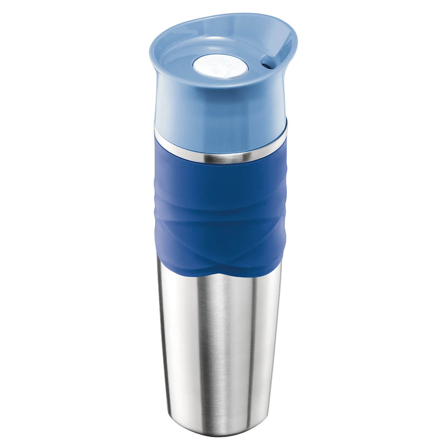 Bardzo szczelny kubek termiczny ze stali. Utrzymuje ciepło do 6 godzin, a zimno do 10 godzin dzięki podwójnym ściankom ze stali nierdzewnej, pomiędzy którymi jest próżnia. Proste zamykanie i otwieranie – jedną ręką, jednym przyciskiem. Silikonowa opaska antypoślizgowa w kolorze niebieskim ułatwia trzymanie i zapobiega wyślizgiwaniu się kubka z ręki. Pasuje do większości uchwytów samochodowych. Przystosowane do mycia ręcznie i w zmywarce. Pojemność 320 ml. Materiał: INOX 304, 5-PP polipropylen uznawany za jeden z najbezpieczniejszych dla naszego zdrowia plastików. Wymiary produktu: 77,1 × 79,4 × 222,6 mm.