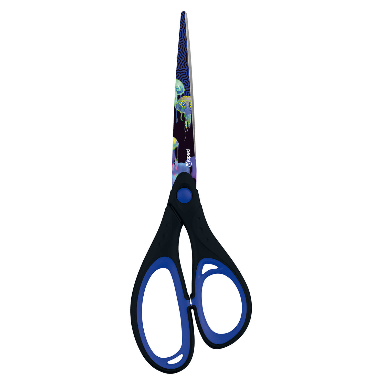 Ostrza wykonane ze stali nierdzewnej pokryte grafikami morskich głębin. Miękkie wewnątrz, asymetryczne uchwyty. Długość 21 cm.