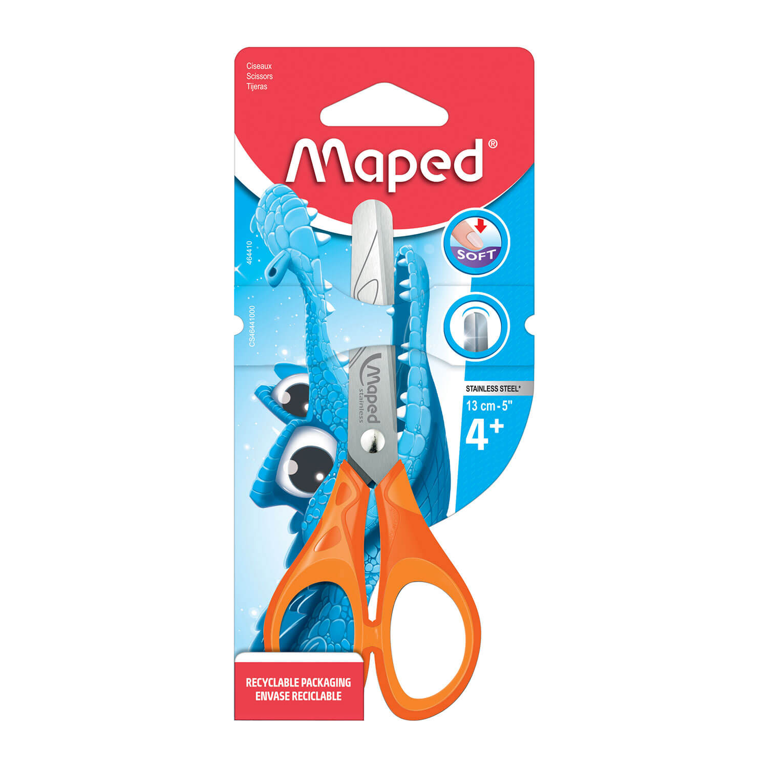 Nożyczki szkolne wykonane ze stali nierdzewnej. Grawerowane ostrza z zaokrąglonymi końcami o średnicy 10 mm. Plastikowe uchwyty, miękkie w środku, profilem dostosowane do dziecięcej dłoni. Długość 13 cm. Miks 3 kolorów: niebiesko-granatowe, czerwono-czarne i różowo-fioletowe.