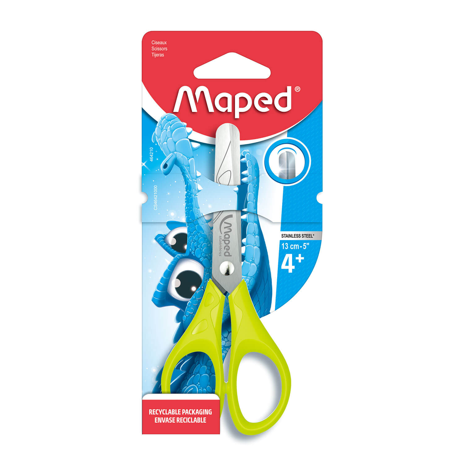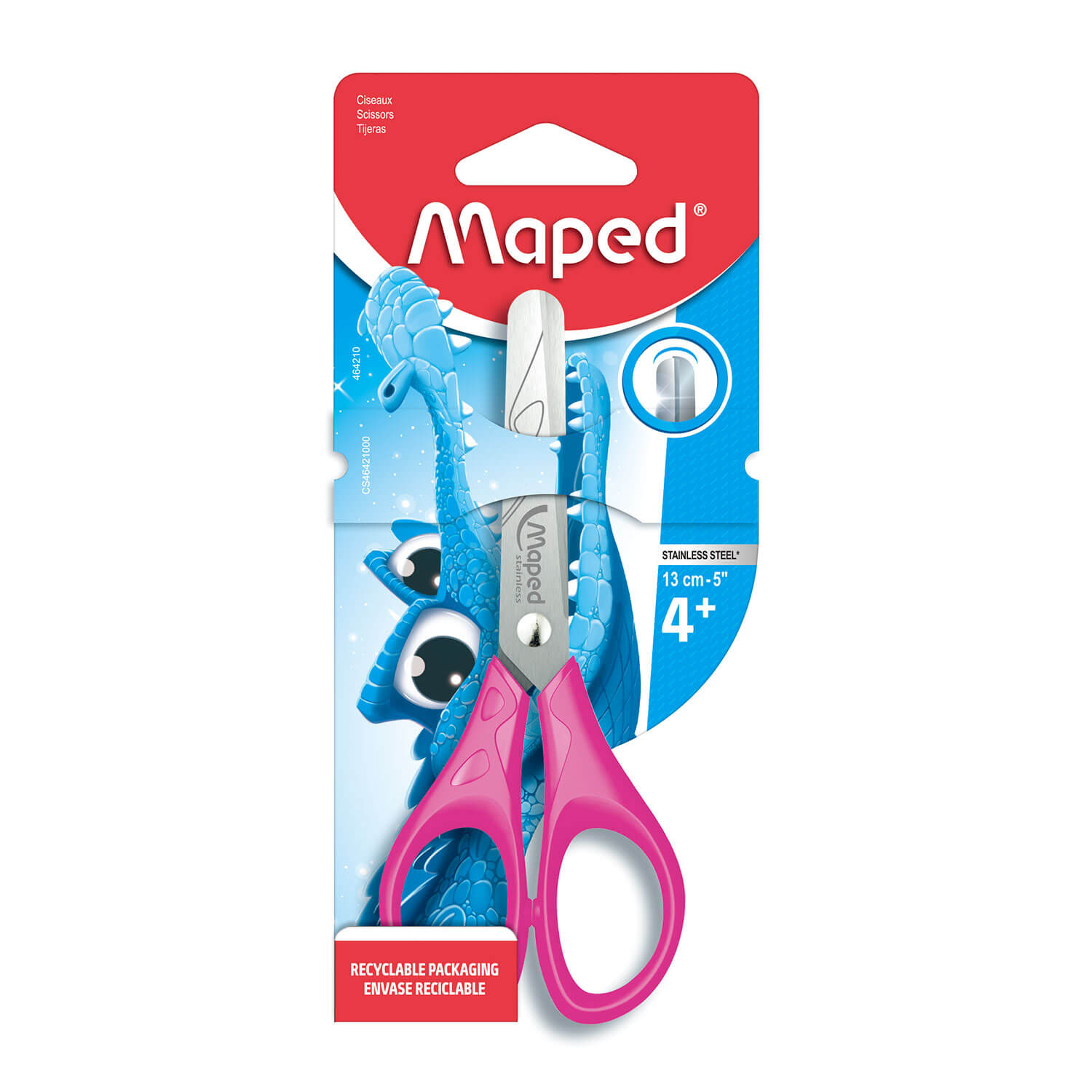 Nożyczki dla dzieci ze stali nierdzewnej. Grawerowane ostrza z zaokrąglonymi końcami o średnicy 10 mm. Plastikowe uchwyty profilem dostosowane do dziecięcej dłoni. Długość 13 cm. Miks 3 kolorów: niebieskie, zielone i różowe.