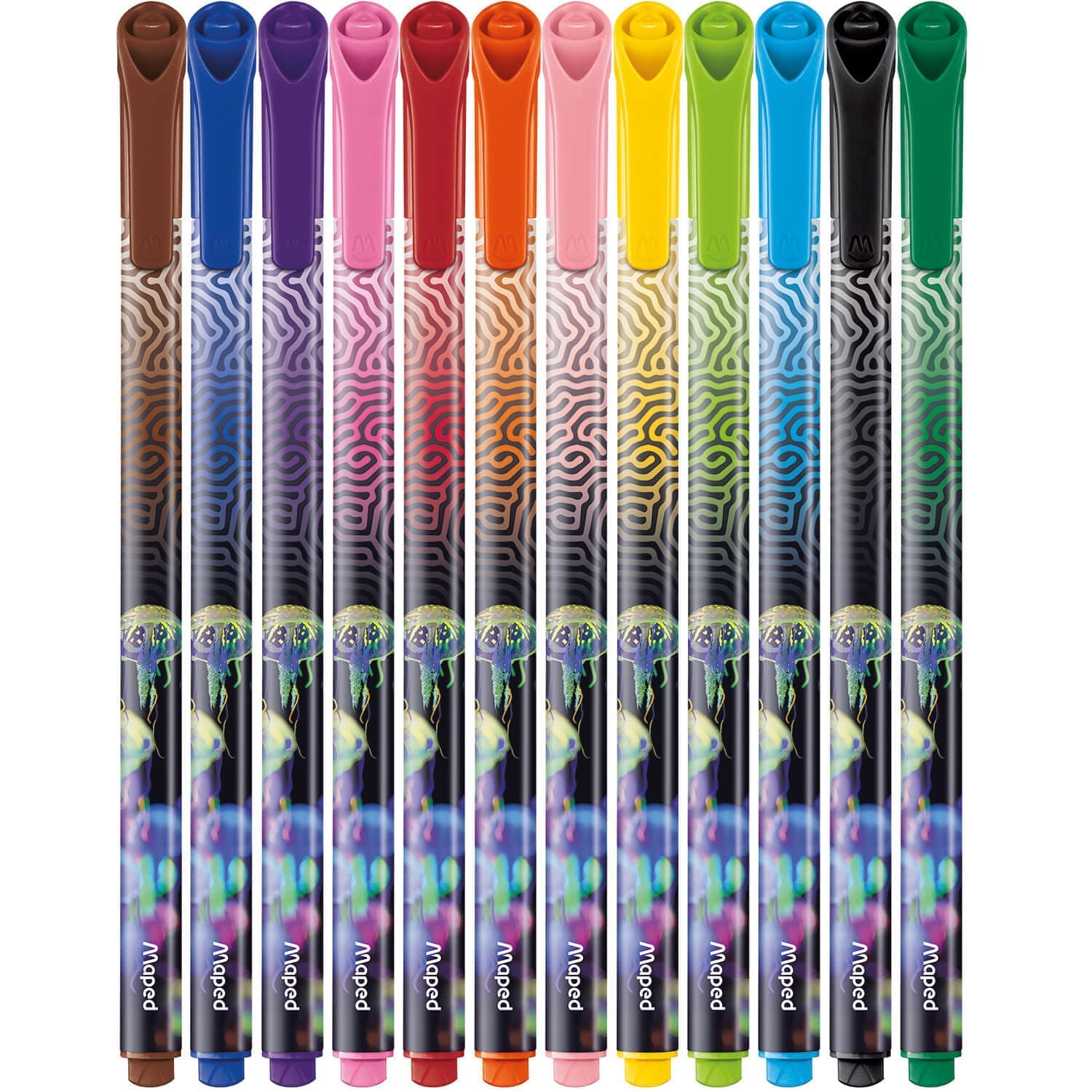 Pisaki w 12 kolorach. Uniwersalna seria do szkoły, do pracy, na uczelnię, do pisania, rysowania, kolorowania i ozdabiania. Dla każdego, kto lubi kolorowe notatki w intensywnych kolorach. Tusz spieralny z większości tkanin. Bezpieczna, zablokowana przed usunięciem końcówka o grubości 0,8 mm jest jednocześnie wytrzymała na nacisk. Wykonana z poliestru jest trwalsza w porównaniu ze zwykłymi pisakami. Trójkątny, ergonomiczny przekrój korpusu ozdobionego grafikami morskich głębin poprawia komfort pisania. Bezpieczna, wentylowana skuwka z klipsem.
