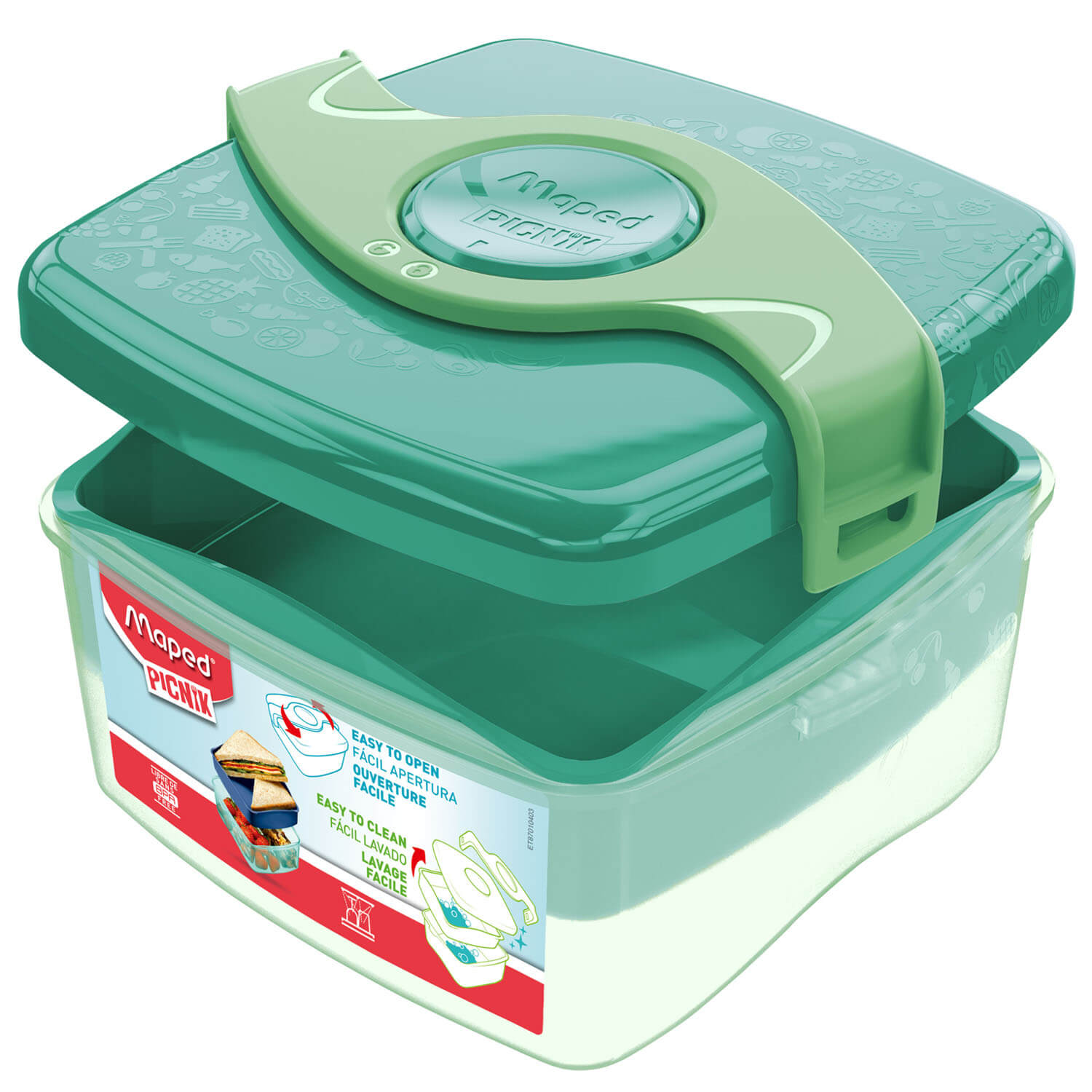Dwukomorowe, stylowe pudełko lunchowe wykonane z tworzywa sztucznego. Umożliwia oddzielenie od siebie różnych składników i pozwala dłużej zachować ich świeżość. Wyjmowany element ułatwia podgrzewanie części posiłku. Proste otwieranie jednym ruchem. Przystosowane do mycia w zmywarce i podgrzewania w kuchence mikrofalowej. Nie przenosi i nie utrzymuje zapachów żywności. Zaokrąglone krawędzie. Spełnia normy europejskie dla produktów przeznaczonych do kontaktu z żywnością. Pojemność 1,4 l. Kolor zielony.