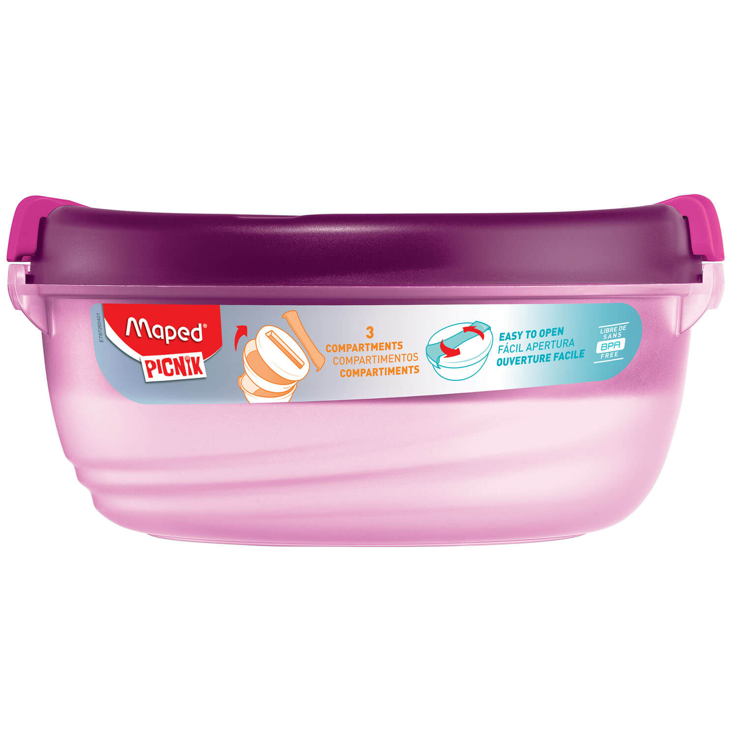 Dwukomorowe, okrągłe pudełko lunchowe typu misa wykonane z tworzywa sztucznego. Umożliwia oddzielenie od siebie różnych składników i pozwala dłużej zachować ich świeżość. Wyjmowany element ułatwia podgrzewanie części posiłku. W pokrywie zamykany schowek na sztućce lub serwetki. Proste otwieranie jednym ruchem. Zaokrąglone krawędzie. Przystosowane do mycia w zmywarce i podgrzewania w kuchence mikrofalowej. Nie przenosi i nie utrzymuje zapachów żywności. Spełnia normy europejskie dla produktów przeznaczonych do kontaktu z żywnością. Parametry techniczne: pojemność 1,4 l, materiał: PP-5, ABS-07. Kolor różowy.