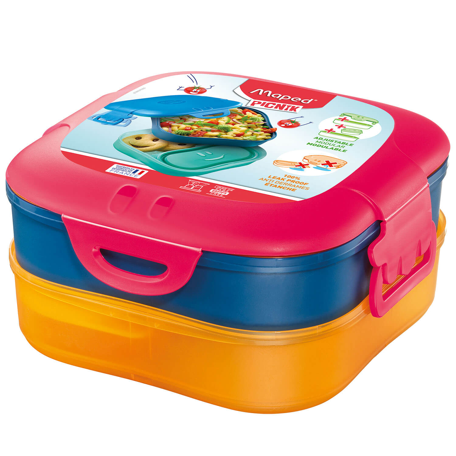 Pudełko lunchowe dwupoziomowe 3 w 1. Skład zestawu: 1 pojemnik jednokomorowy, 1 pojemnik dwukomorowy, 1 mały pojemnik z elastyczną pokrywką o pojemności 150 ml, pokrywa główna z klamrami. Dzięki swojemu kształtowi jest wygodny i praktyczny w użytkowaniu. W zależności od potrzeb zestaw zmienia swój rozmiar – można używać dwa spiętrowane pojemniki z pokrywą lub tylko jeden – ze snackboxem w środku lub bez. Snackboxy można też używać osobno na mniejsze przekąski, bez pudelka lunchowego. Jeden z pojemników posiada przegródkę, która dzieli go na 2 komory, dając jeszcze więcej możliwości osobnego przechowywania składników posiłku. Bezpieczne zamknięcie – pokrywa wyposażona w cztery klamry/zaczepy i silikonową uszczelkę gwarantuje szczelność pojemnika. Można myć w zmywarce na górnej półce. Dostosowany do podgrzewania posiłków w kuchence mikrofalowej bez przykrycia. Wszystkie pojemniki wchodzące w skład zestawu są wytrzymałe na uderzenia i stłuczenia. Atrakcyjne kolory dopasowane do pozostałych produktów z serii Picnik Concept Kids. Pojemniki wykonane z materiału, który nie wchodzi w reakcje z jedzeniem. Parametry techniczne: pojemność – 1,4 litra, materiał – wszystkie pojemniki i pokrywa główna – PP, pokrywa snackboxu – LDPE, opakowanie – kartonowa przepaska z niezbędnymi informacjami. Kolor różowy.