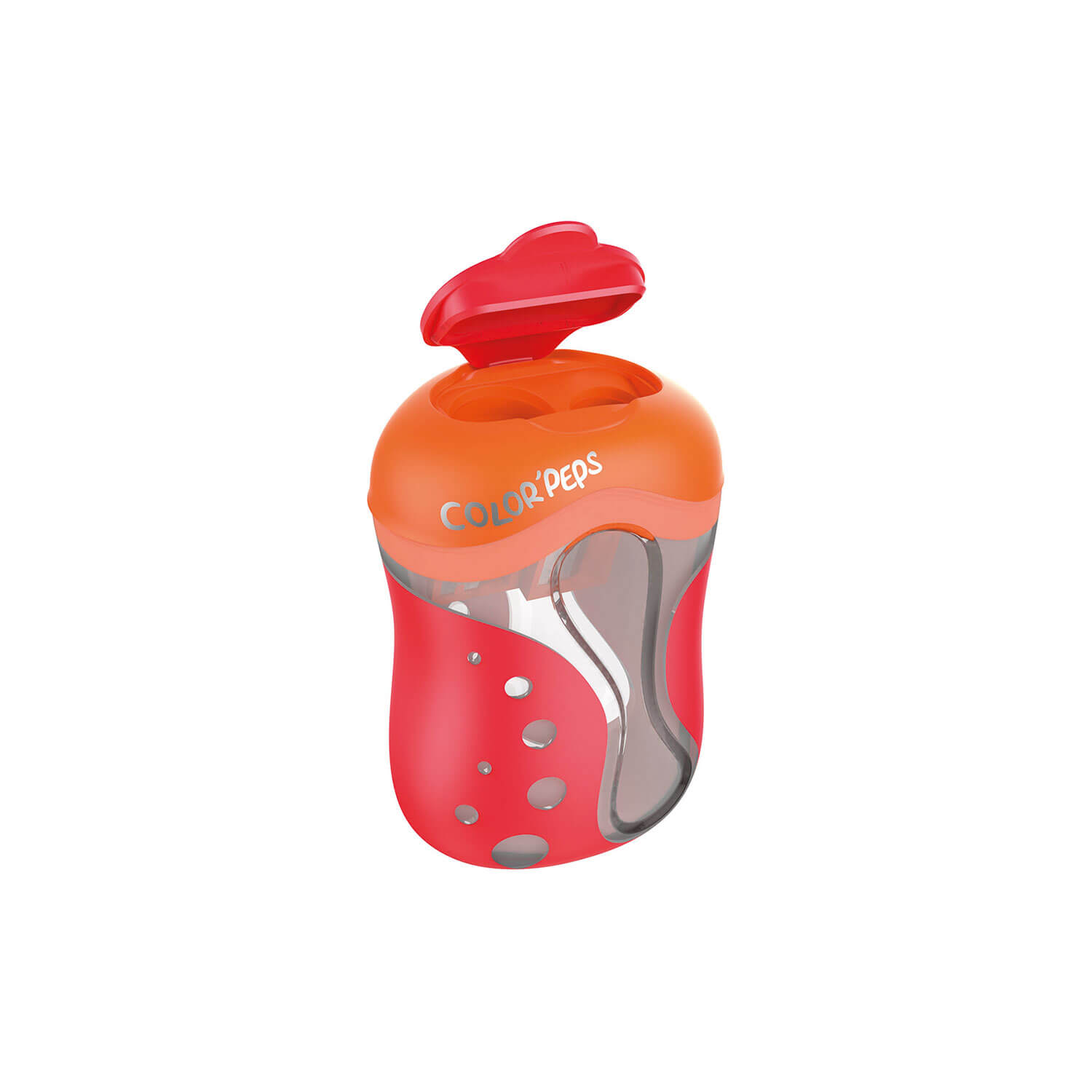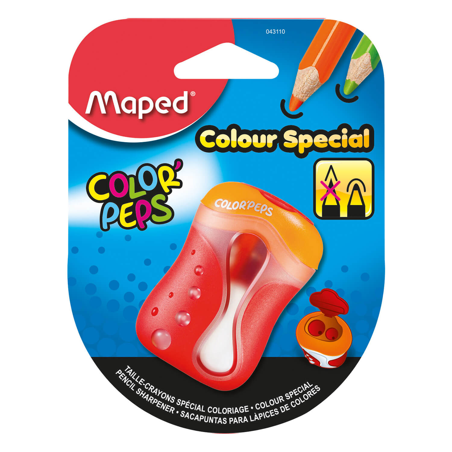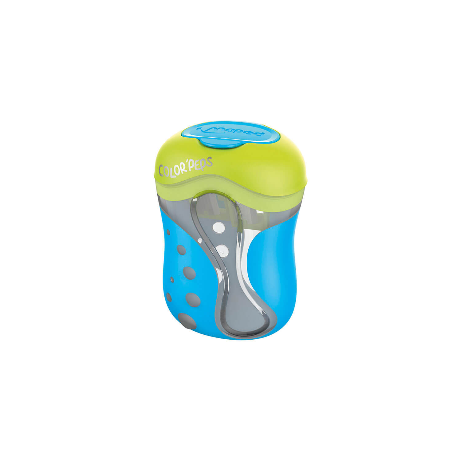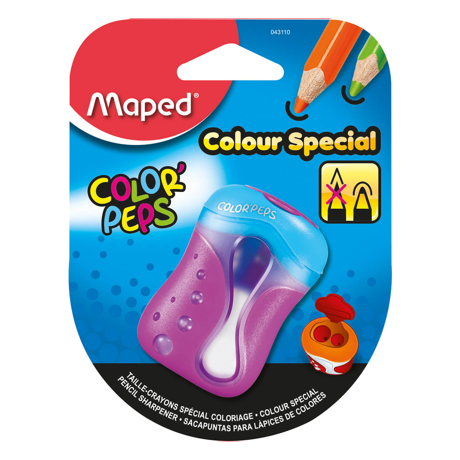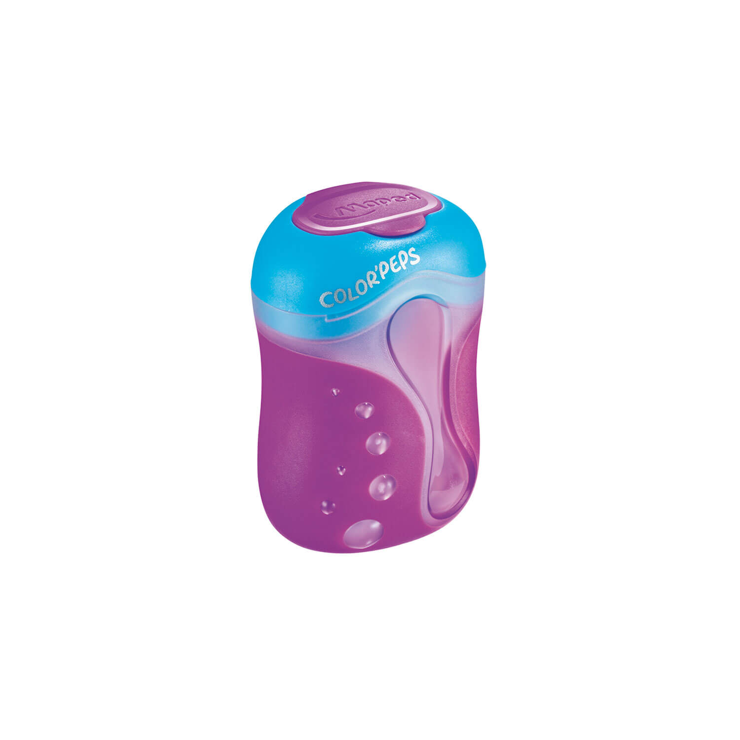 Temperówka Color’Peps jest przeznaczona specjalnie do temperowania kredek. Temperuje na obło, co wpływa na mniejszą łamliwość grafitów. Duży pojemnik. Dwa zamykane otwory. Zamknięcie zabezpiecza przed wysypywaniem się pyłu i ścinek z temperówki.