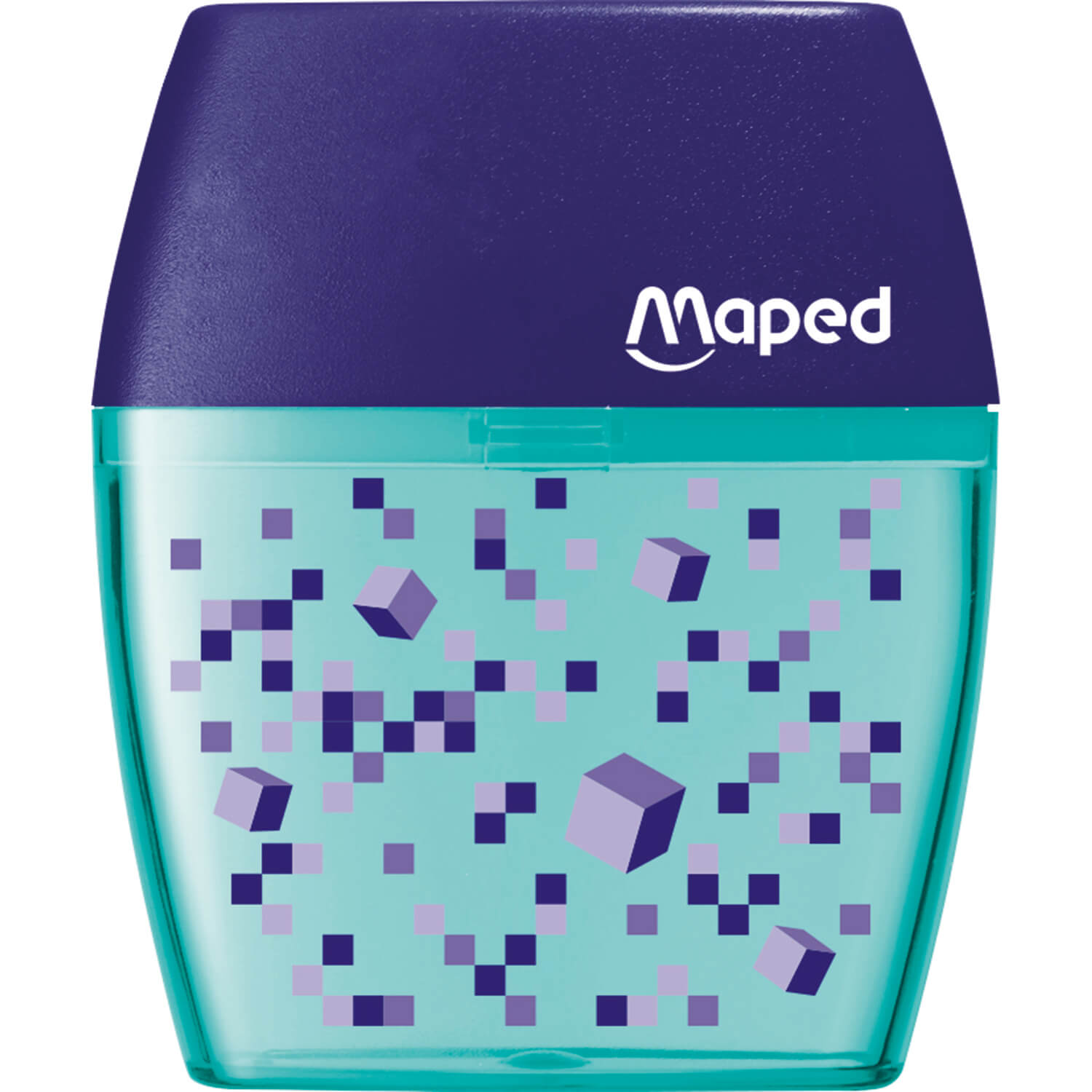 Temperówka z dwoma otworami. Obszerny plastikowy pojemnik. Dekorowana grafiką, którą tworzą różnokolorowe kwadraciki układające się w fantazyjną całość. 1 sztuka na blistrze.