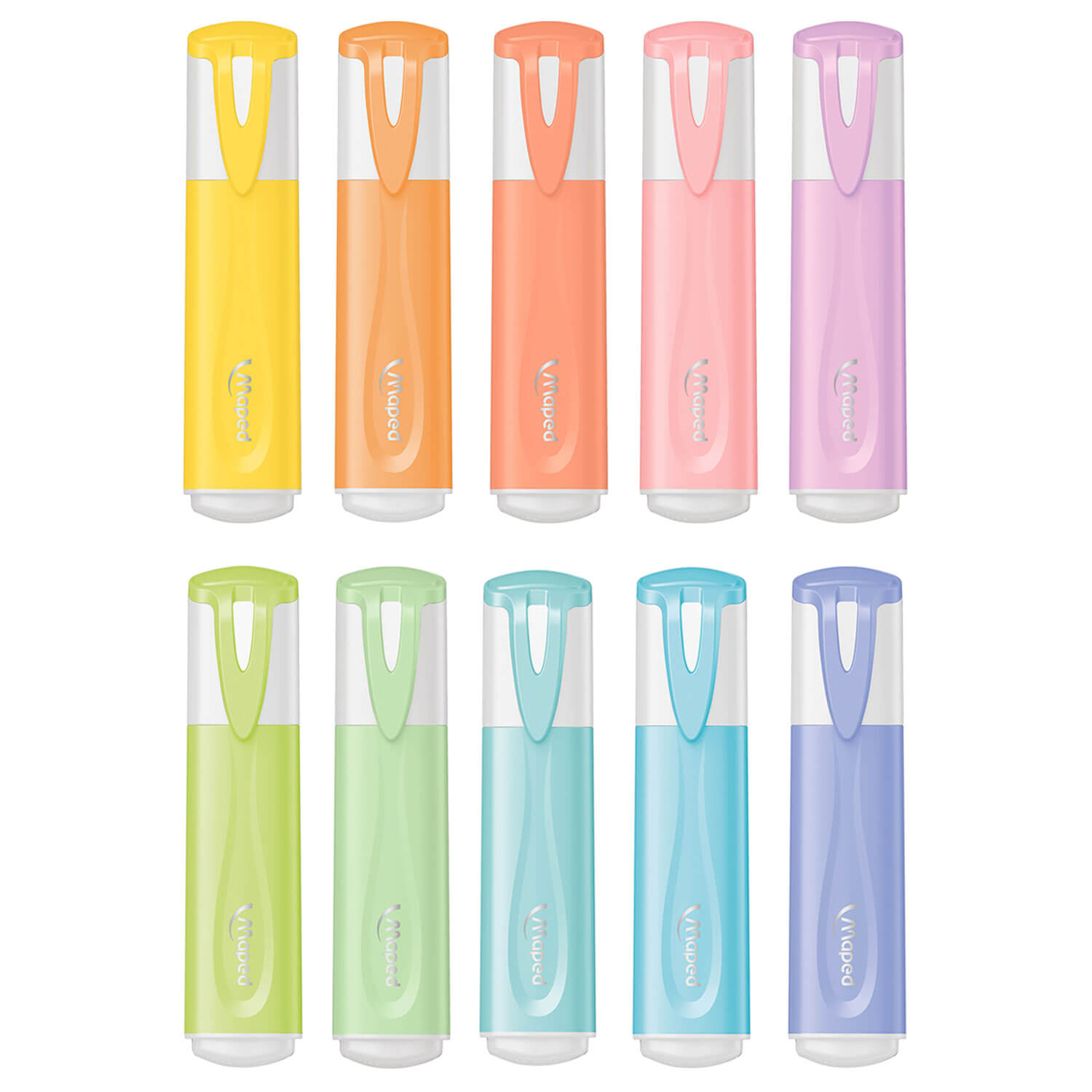 Zakreślacz Classic New Pastel. Klasyczny kształt obudowy. Tusz nietoksyczny o wysokiej wydajności i trwałości, odporny na działanie światła. Do wszystkich papierów standardowych, samokopiujących, fotokopii, termopapierów i papierów faksowych. Pozostawiony bez skuwki nie traci swoich właściwości nawet po 4 godzinach. Ścięta końcówka umożliwia pisanie cienką i grubą linią, od 1 do 5 mm. Etui zawiera zakreślacze w 10 pastelowych kolorach w tym 4 w nowych odcieniach.