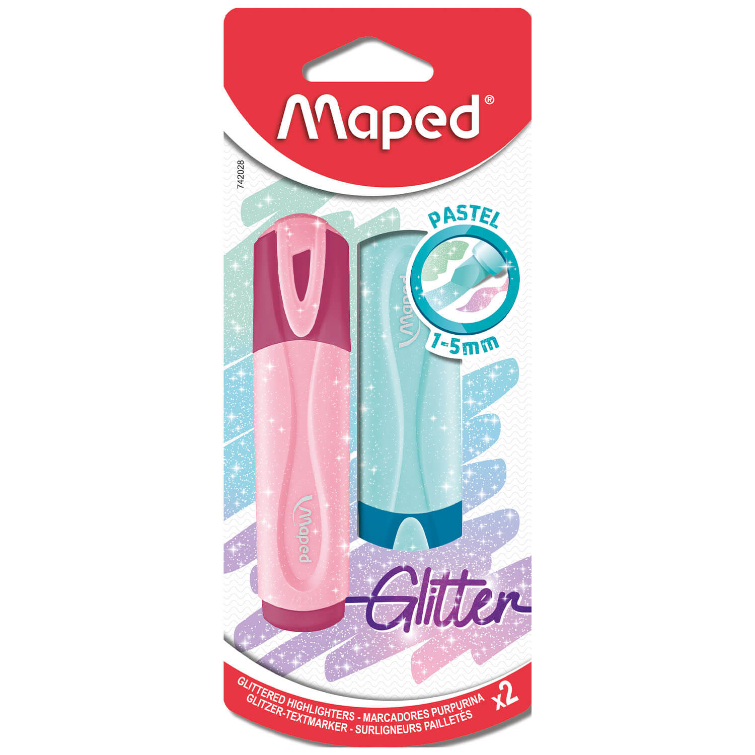 Zakreślacz z BROKATEM w tuszu i na obudowie. Nadaje wyjątkowy, połyskujący efekt zakreślanym powierzchniom. Klasyczny kształt obudowy. Tusz nietoksyczny o wysokiej wydajności i trwałości, odporny na działanie światła. Do wszystkich papierów standardowych, samokopiujących, fotokopii, termopapierów i papierów faksowych. Pozostawiony bez skuwki nie traci swoich właściwości nawet po 4 godzinach. Ścięta końcówka umożliwia pisanie cienką i grubą linią, od 1 do 5 mm. 2 sztuki w dwóch wersjach kolorystycznych: różowy i niebieski oraz zielony i fioletowy.
