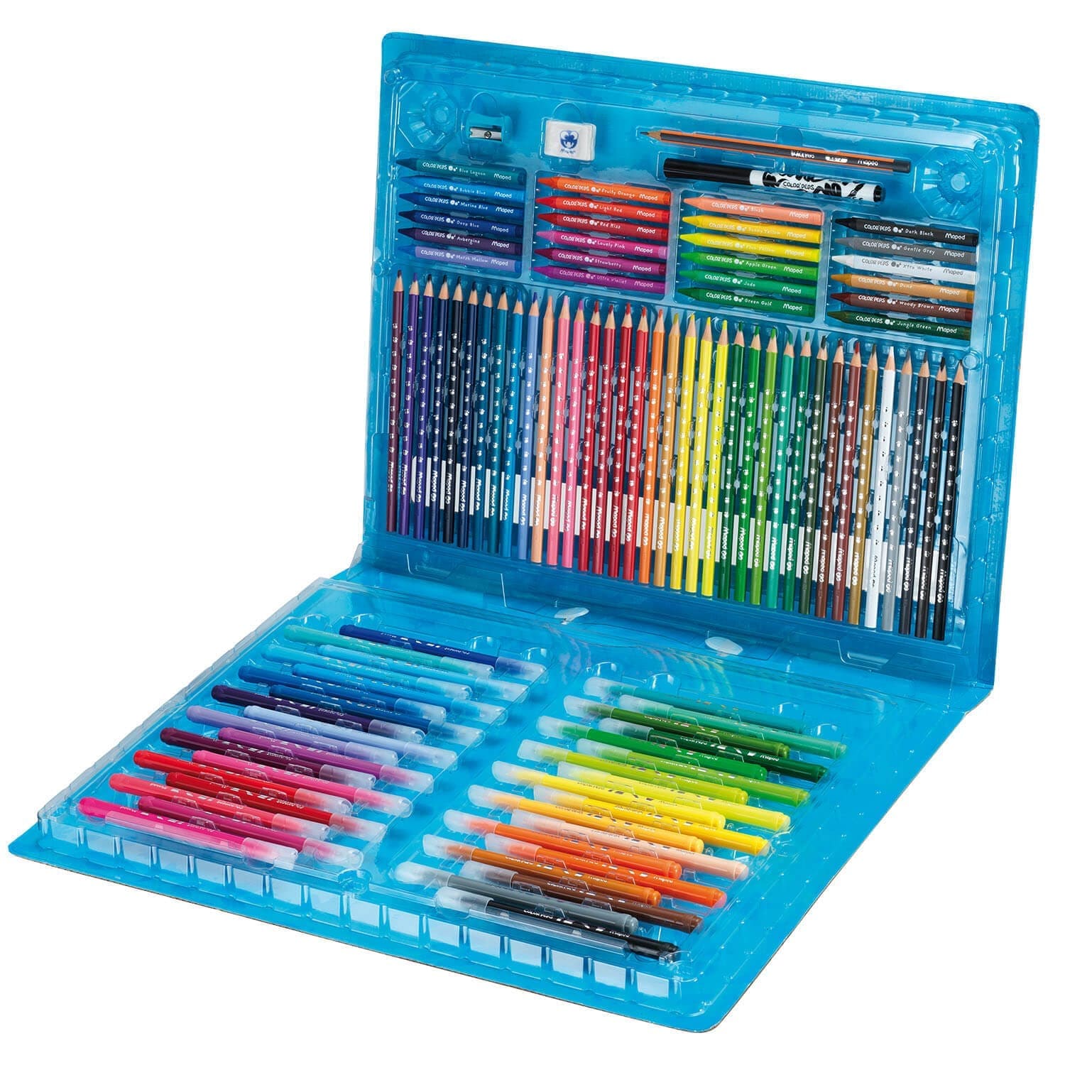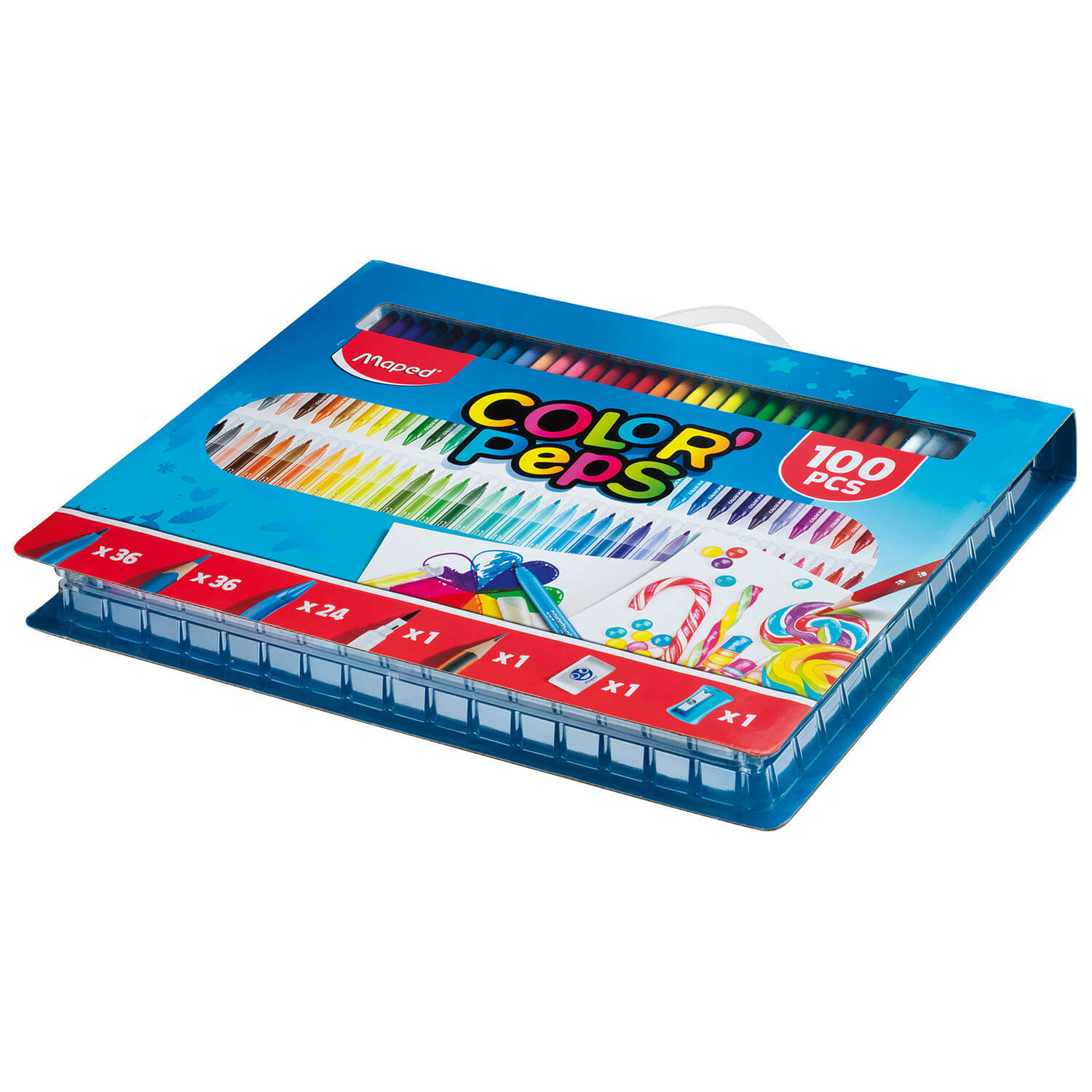Mobilny zestaw artystyczny Color’Peps w kartonowej walizce z uchwytem. Plastikowe separatory i przegródki ułatwiają utrzymanie porządku. Zawartość dopasowana do potrzeb początkujących artystów: 36 spieralnych flamastrów z końcówką średniej grubości, 36 kredek z żywicy syntetycznej, elastycznych i bardzo odpornych na złamanie, 24 kredki świecowe, 1 flamaster z końcówką typu pędzelek w kolorze czarnym, 1 ołówek, 1 gumka biała, 1 temperówka jednootworowa bez pojemnika.
